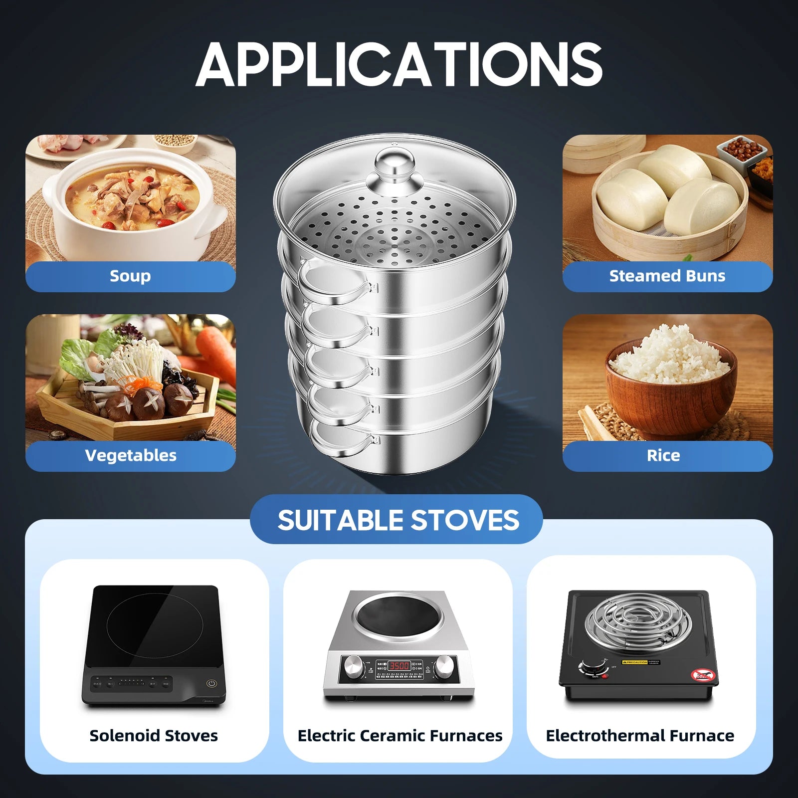 28cm 5-Tier Steam Cooker, Stainless Steel Steamer, Kitchen Cooking Steamer, Pan Cook Pot with Glass Lid Multi-Layer Cookware