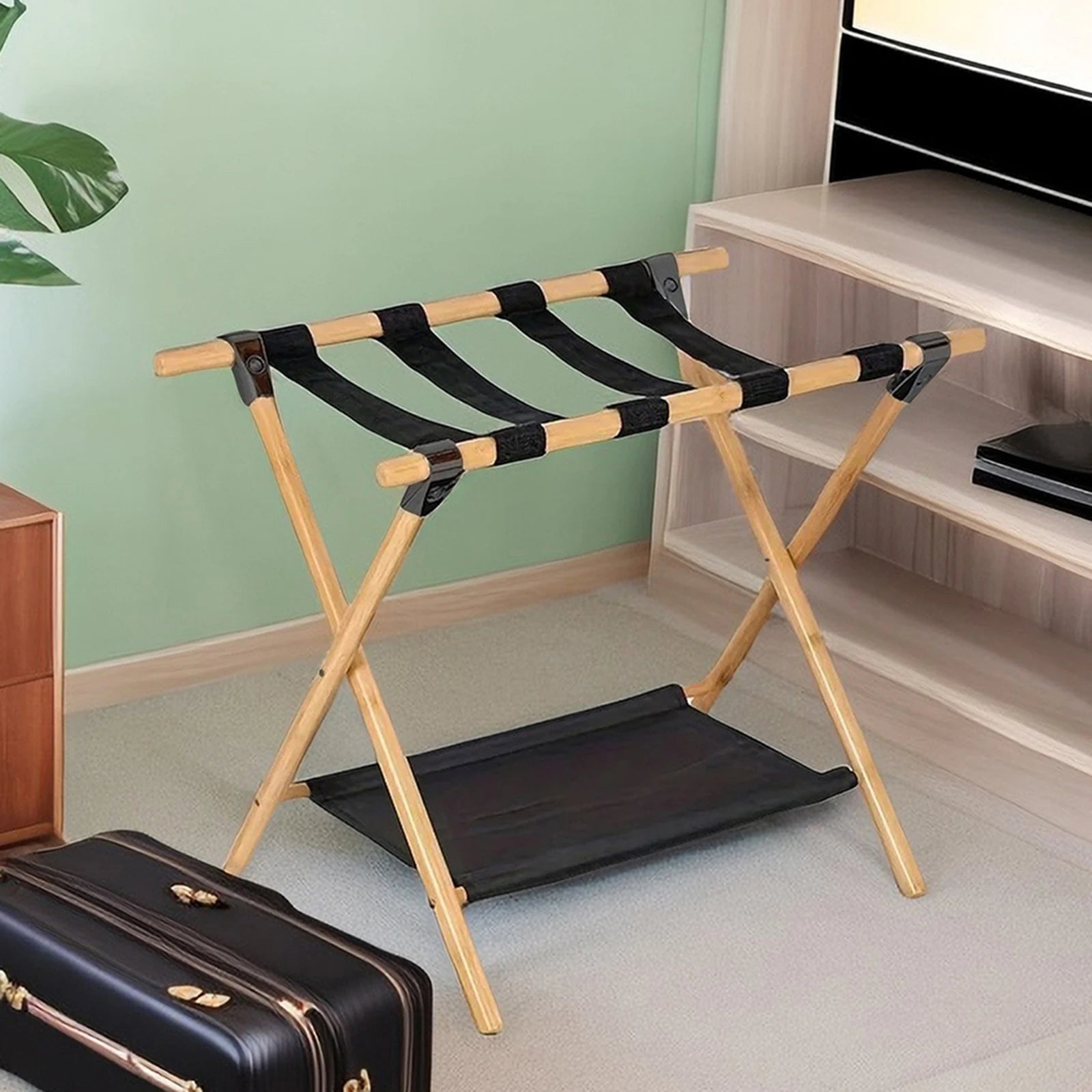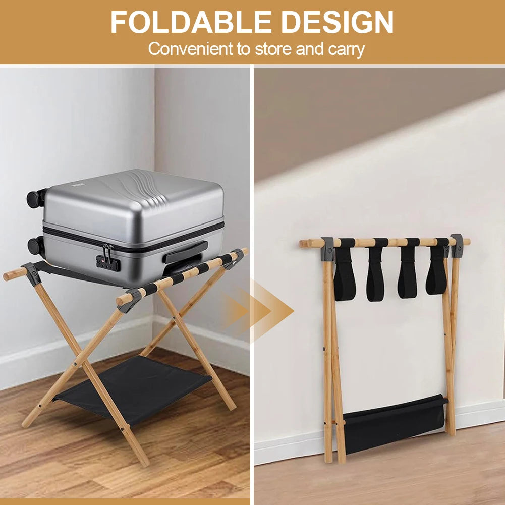 Bamboo Suitcase Stand Foldable Luggage Stand with Nylon Straps Suitcase Holder Suitable for Guest Room Bedroom Hotel