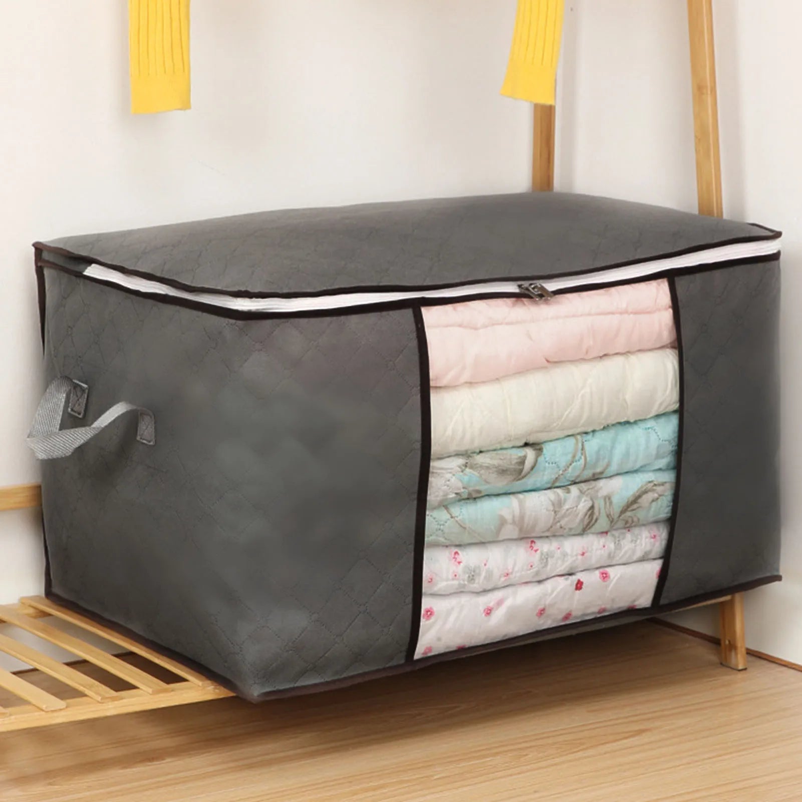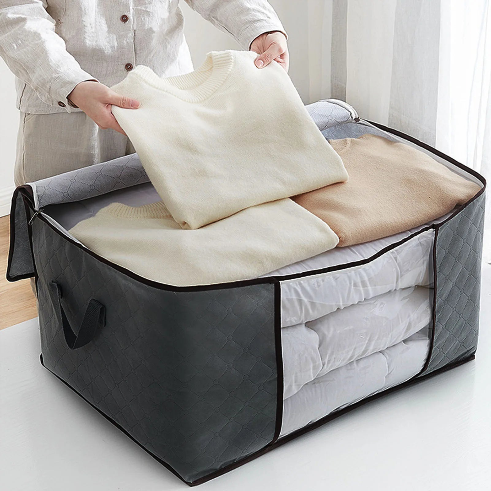 Blanket Storage Bag Reinforced Handle Closet Organizer Foldable Stackable Clothes Storage Bag with Clear PVC Window for Bedding