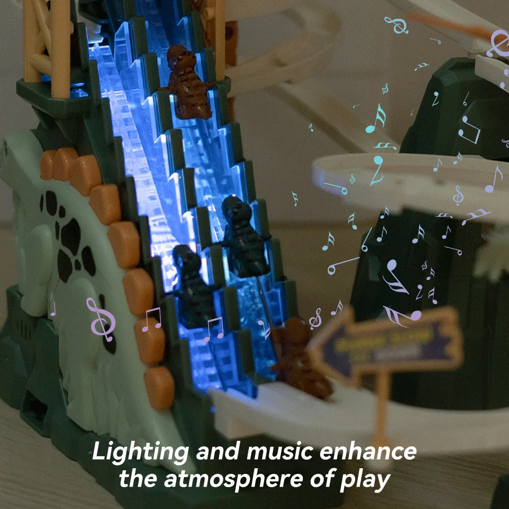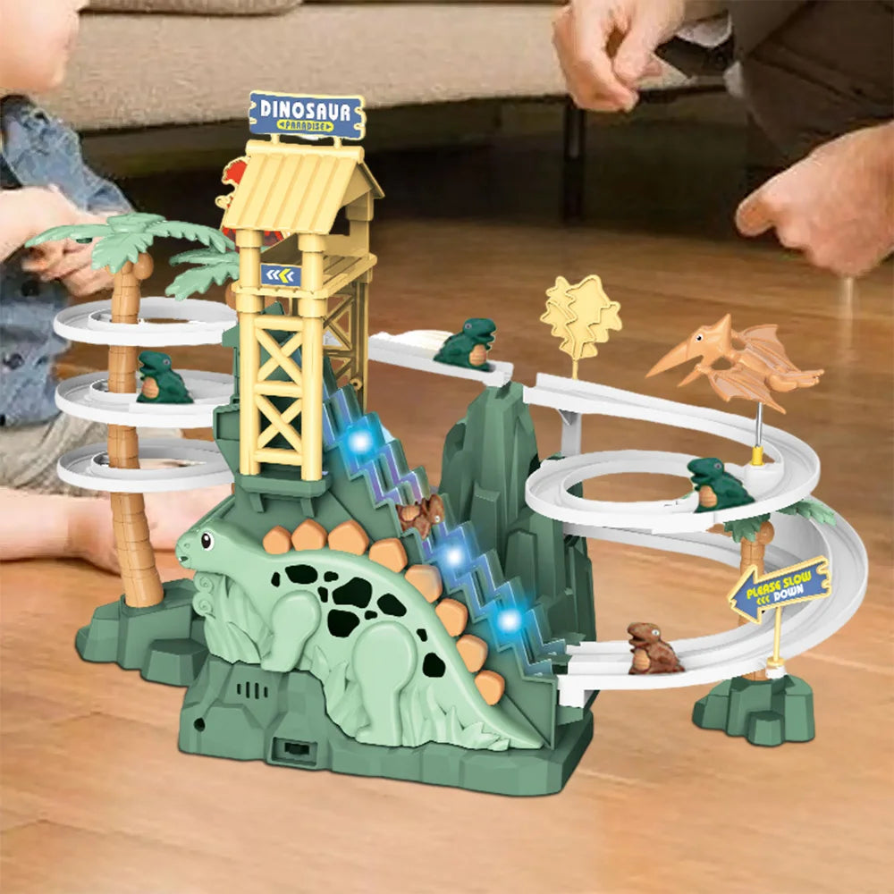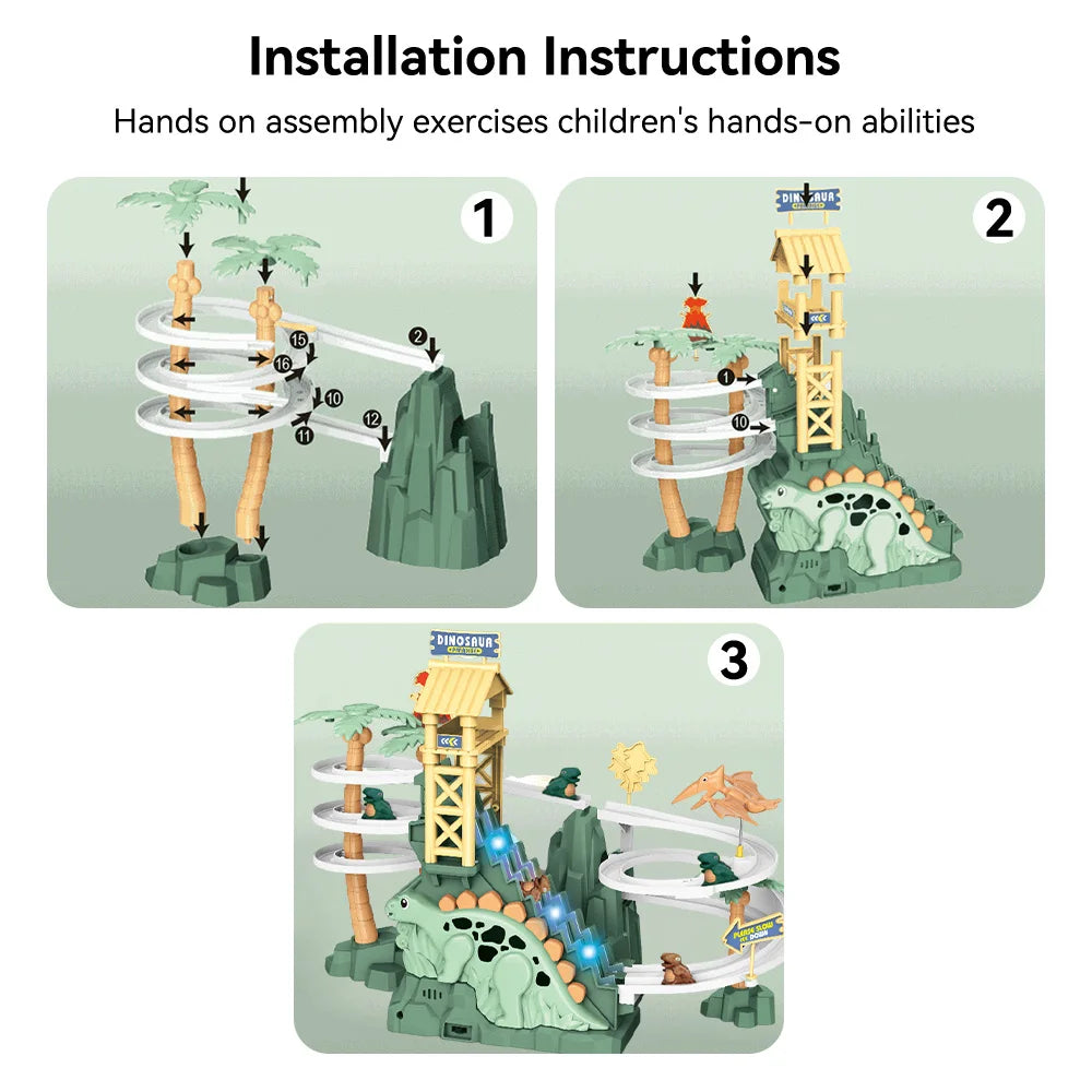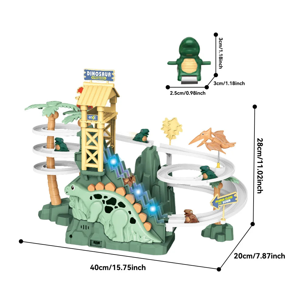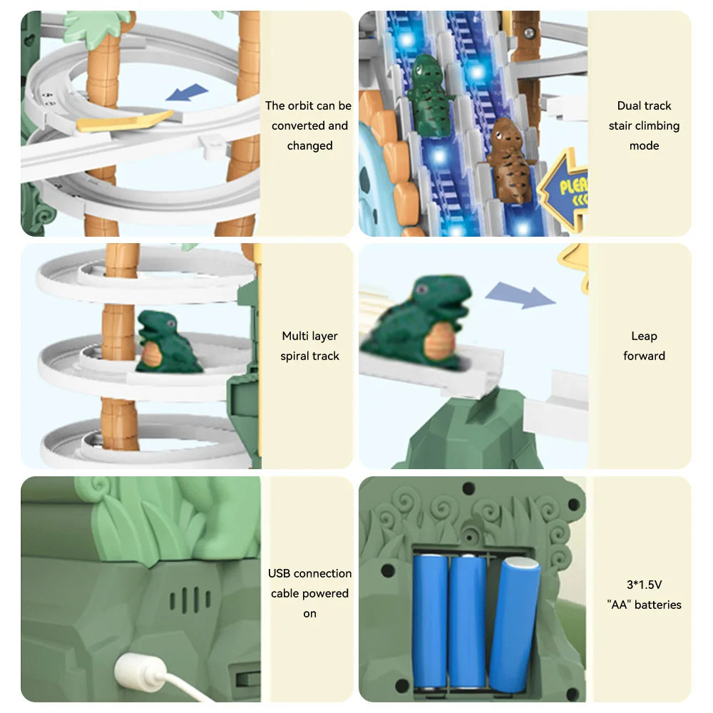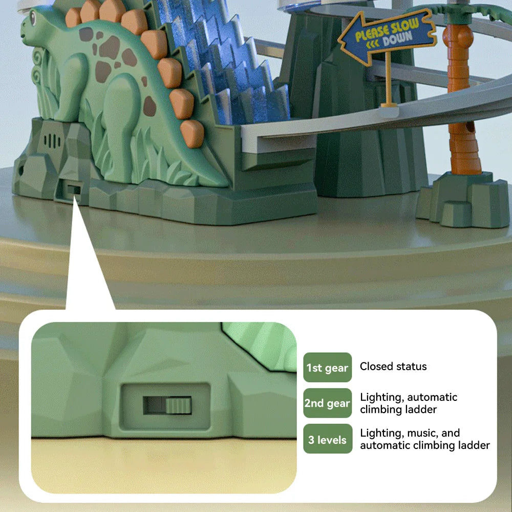Features: Automatic climbing stairs, adventure level,Double track dinosaur slide