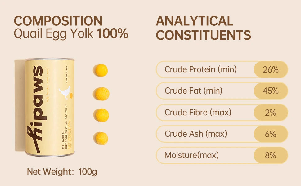 Hipaws All Natural Quail Egg Yolk Freeze-Dried Cat Treats Toppers (100g Tube), Fresh Quail Egg Yolk Dog Treats