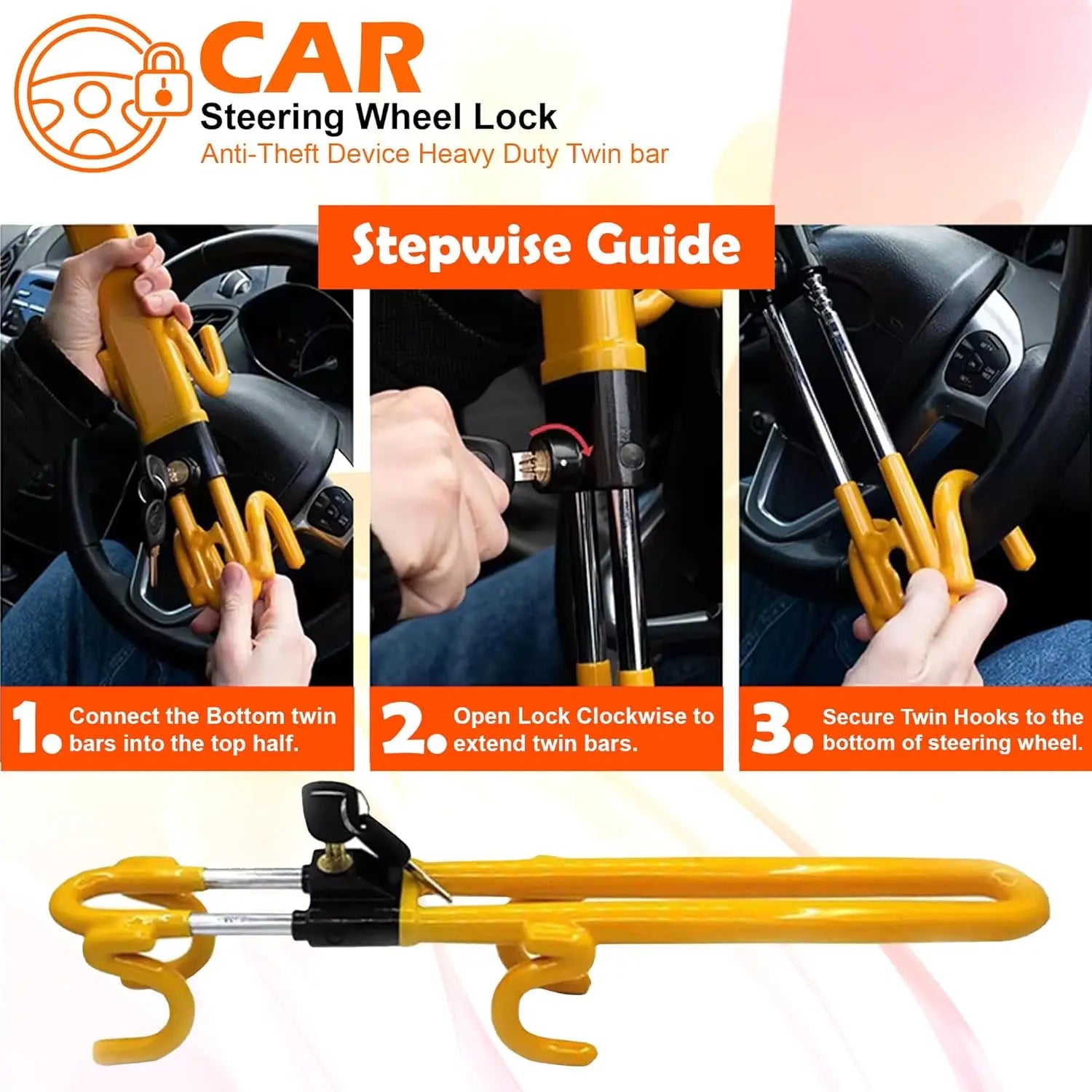 Steering Wheel Lock Anti-Theft Heavy Duty Secure Car Device, Adjustable Length Clamp Double Hook Locks Universal Fit (Yellow)