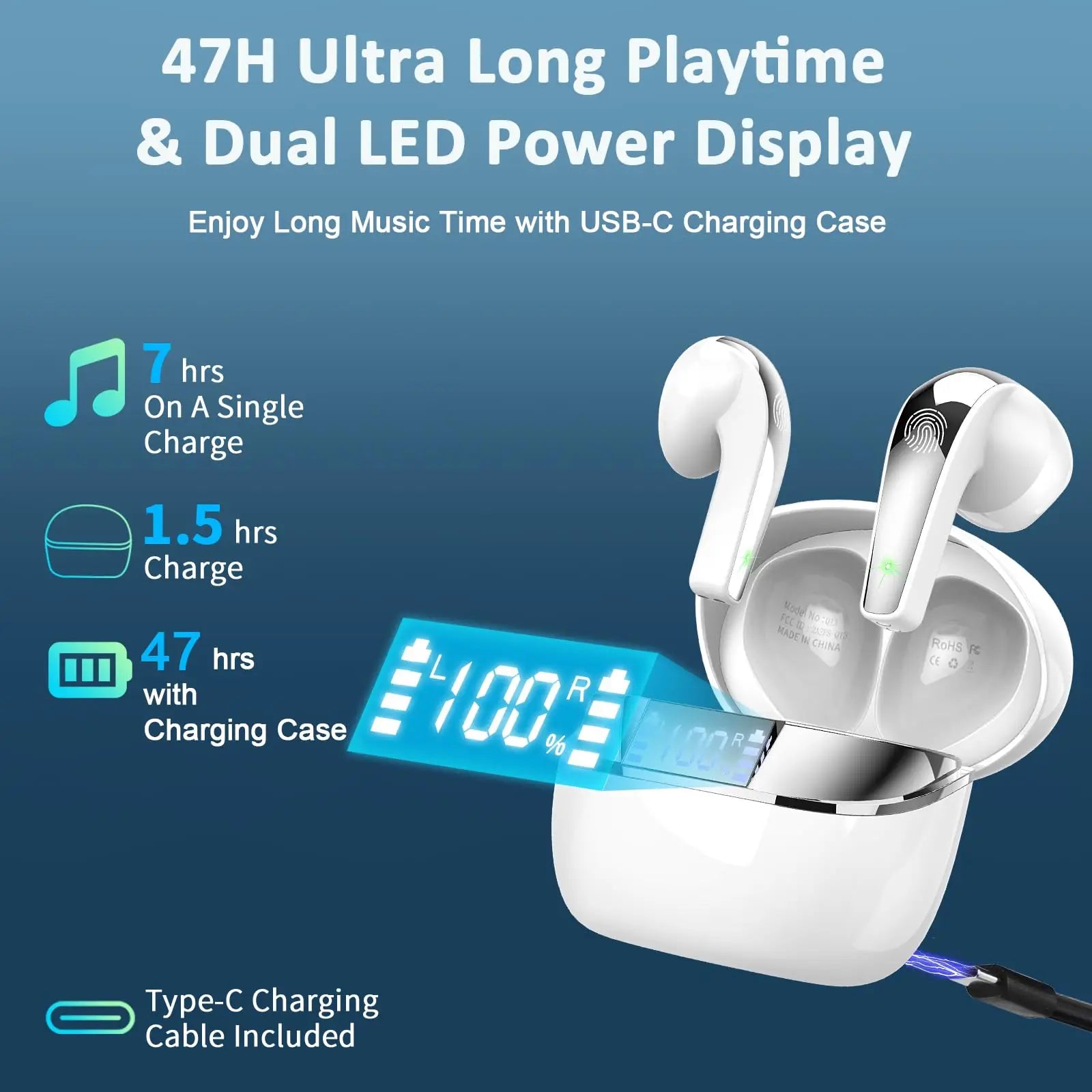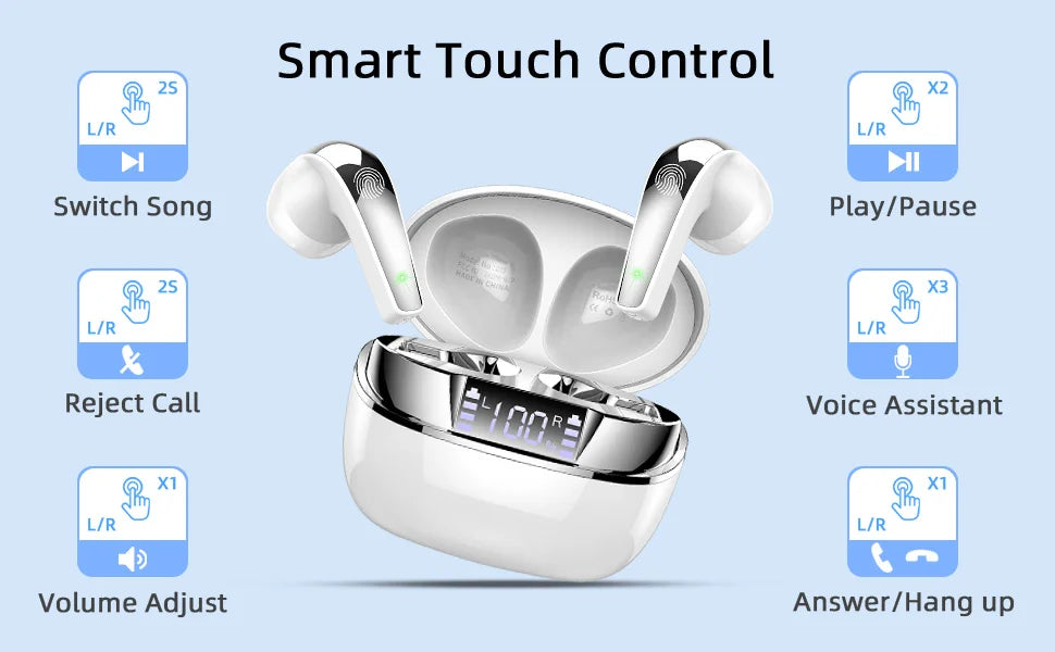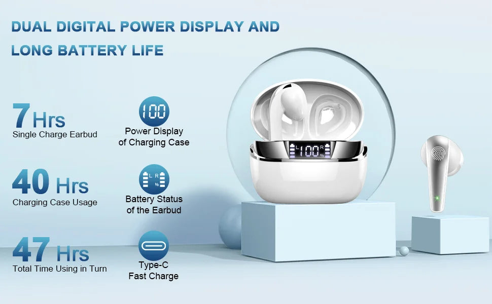 Wireless Earbuds, Bluetooth 5.3 Headphones Sports Headphones In Ear with ENC Noise Cancelling Mic, 30H Playback , LED Display.