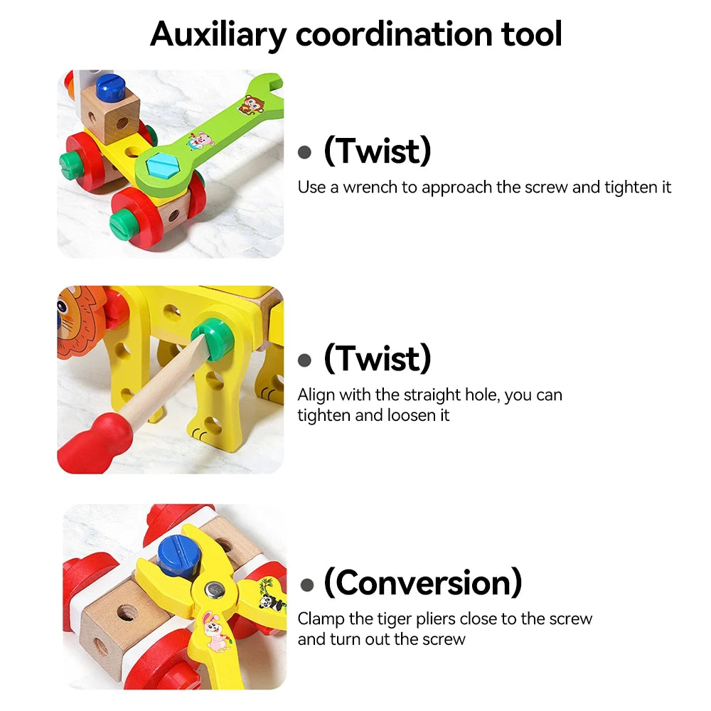 Wooden Kids Tool Set Montessori Educational Toys Animal Building Blocks Assembly Learning Gift for Boys and Girls 3-6 Age